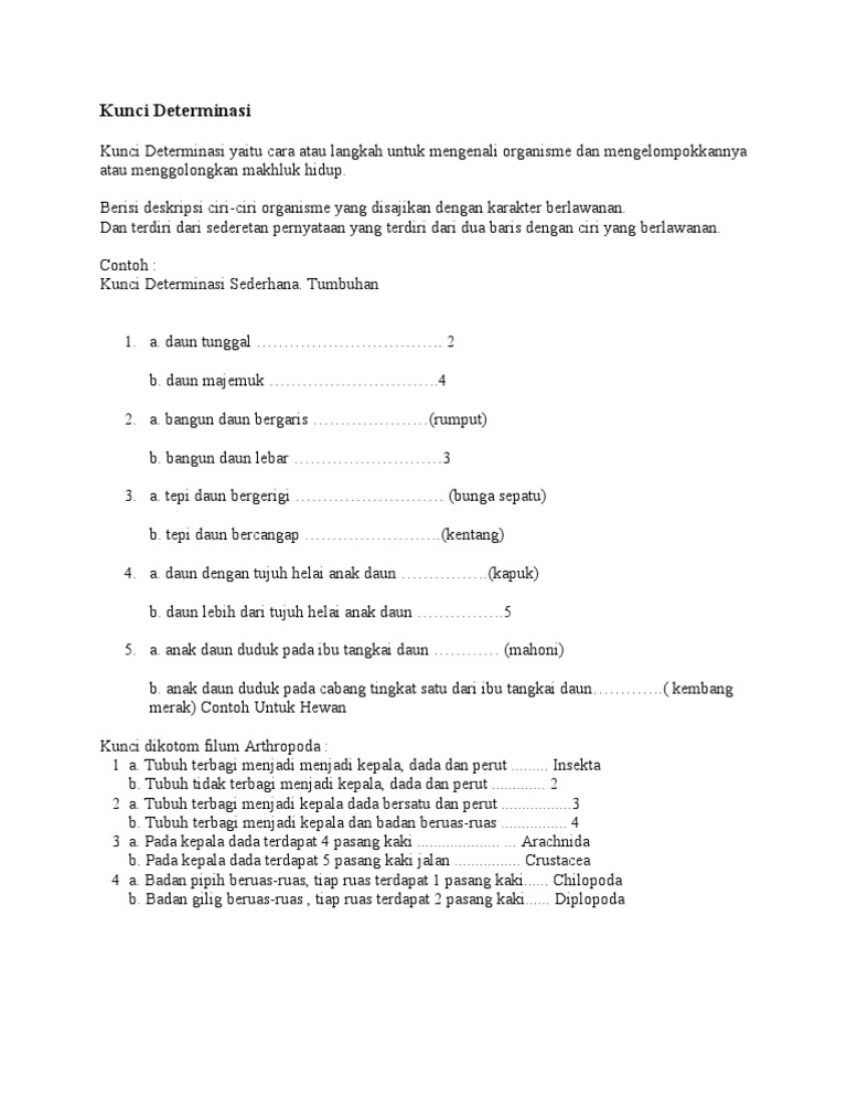 Saranailmu.com dalam hal ini akan menjelaskan mengenai apa itu pengertian kunci determinaasi, contoh kunci determinasi hewan, contoh kunci determinasi tumbuhan, cara menggunakan kunci determinasi, kunci dikotomi, kunci dikotomi tumbuhan dan hewan, contoh kunci determinasi sederhana tumbuhan, kunci determinasi tumbuhan lengkap. Kunci determinasi dibuat bertahap, bangsa, suku, marga, atau jenis dan seterusnya. Diagram kunci determinasi tumbuhan 1b. Lumut adalah tumbuhan yang tidak memiliki talus (jaringan yang tidak terdeferensiasi pada vegetasi tingkat rendah), maka kunci determinasinya adalah 4b. Data pada diagram kunci dikotom di atas, jika ditulis akan menjadi kunci determinasi sebagai berikut: