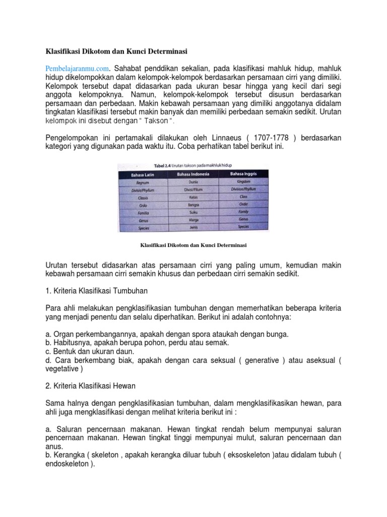 Identifikasi mencakup dua kegiatan, yaitu klasifikasi dan tata nama. Melakukan identifikasi tumbuhan berarti mengungkapkan atau menetapkan identifikasi suatu tumbuhan, yang dalam hal ini tidak lain adalah menentukan namanya yang benar dan tempatnya yang tepat dalam sistem klasifikasi. Diagram tata letak daun spirostik. Tumbuhan lumut dan tumbuhan paku tumbuhan lumut dan tumbuhan paku adalah tumbuhan yang memiliki spora serta berkembang biak dengan cara vegetatif dan generatif. Identifikasi merupakan kegiatan dasar dalam taksonomi. Jadi kunci determinasi dari lumut adalah 1b, 4b. Jawaban diagram kunci dikotom jenis tumbuh tumbuhanberdasarkan klasifikasi lima kingdom kingdom plantae tumbuhan dibagike dalam beberapa filum yakni lumut bryophyta paku pakuan pteridophyta serta tumbuhan berbiji spermatophyta bakteri dimasukkan dalam kingdommonera ganggang algae dimasukkan ke dalam kingdom protista kelima kingdomdiklasifikasi berdasarkan karakteristik yang khas dari setiap. Identifikasi sendiri adalah suatu kegiatan yang sangat dasar di dalam ilmu taksonomi. Dalam dunia tumbuhan ganggang termasuk kedalam dunia thallophyta (tumbuhan talus) karena belum dapat dibedakann akar, batang dan daun secara jelas. Kelompok tersebut dapat didasarkan pada ukuran besar hingga yang kecil dari segi anggota kelompoknya. Kunci berisi keterangan yang disusun berpasangan dan menunjukkan ciri yang berlawanan. Tumbuhan tingkat tinggi (phanerogamae) merupakan tumbuhan berbiji yang berkembang biak secara seksual. Data pada diagram kunci dikotom di atas, jika ditulis akan menjadi kunci determinasi sebagai berikut: