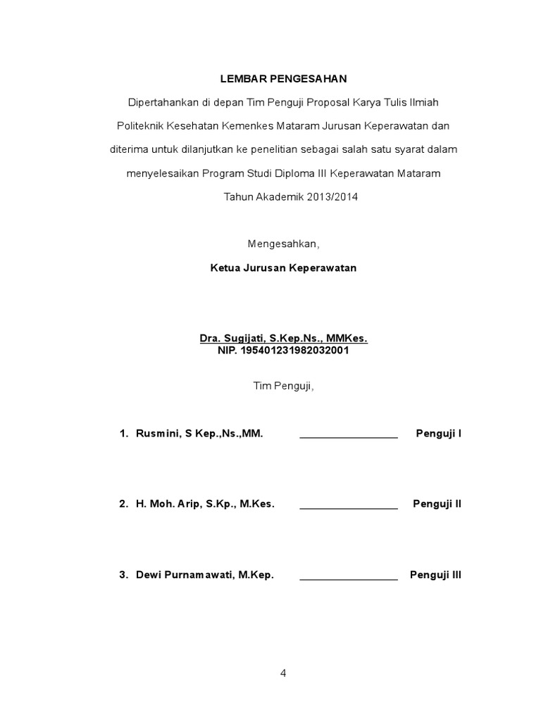 10 Contoh Lembar Pengesahan Proposal Makalah Kti Skripsi Pkl Penelitianilmiah Com from penelitianilmiah.com Karya tulis ilmiah ini telah dipertahankan dan telah diperbaiki sesuai dengan masukan dewan penguji karya tulis ilmiah program studi kebidanan (d iii) sekolah tinggi ilmu kesehatan jenderal achmad yani cimahi pada tanggal 24 agustus 2011. Contoh rincian ke bawah 64 lampiran 19. Pengesahan karya tulis ilmiah, contoh karya ilmiah populer tentang kesehatan pdf daftar, karya tulis ilmiah kadar hemoglobin pada mahasiswa yang, karya ilmiah tentang pencemaran air berbagi ilmu dan, contoh kata halaman persembahan skripsi menyentuh untuk, sistematika penulisan karya tulis ilmiah Program studi kebidanan (d iii) sekolah tinggi ilmu kesehatan jenderal achmad yani cimahi pembimbing i. Indonesia memiliki kekayaan sumberdaya hayati tropika yang unik, kelimpahan sinar matahari, air dan tanah dan juga potensi pe rtanian khususnya dibidang peternakan yang sangat besar. Bagian pelengkap pendahuluan dipersiapkan sebagai bahan informasi awal bagi pembaca sebelum memasuki uraian pada bagian isi karya ilmiah. Contoh karya tulis ilmiah kamis 21 februari 2013. Sebagai halaman terdepan yang pertama terbaca dari kti, halaman sampul harus dapat memberikan informasi singkat kepada pembaca tentang karya ilmiah tersebut yang berupa judul, identitas penulis, institusi, dan tahun pengesahan.